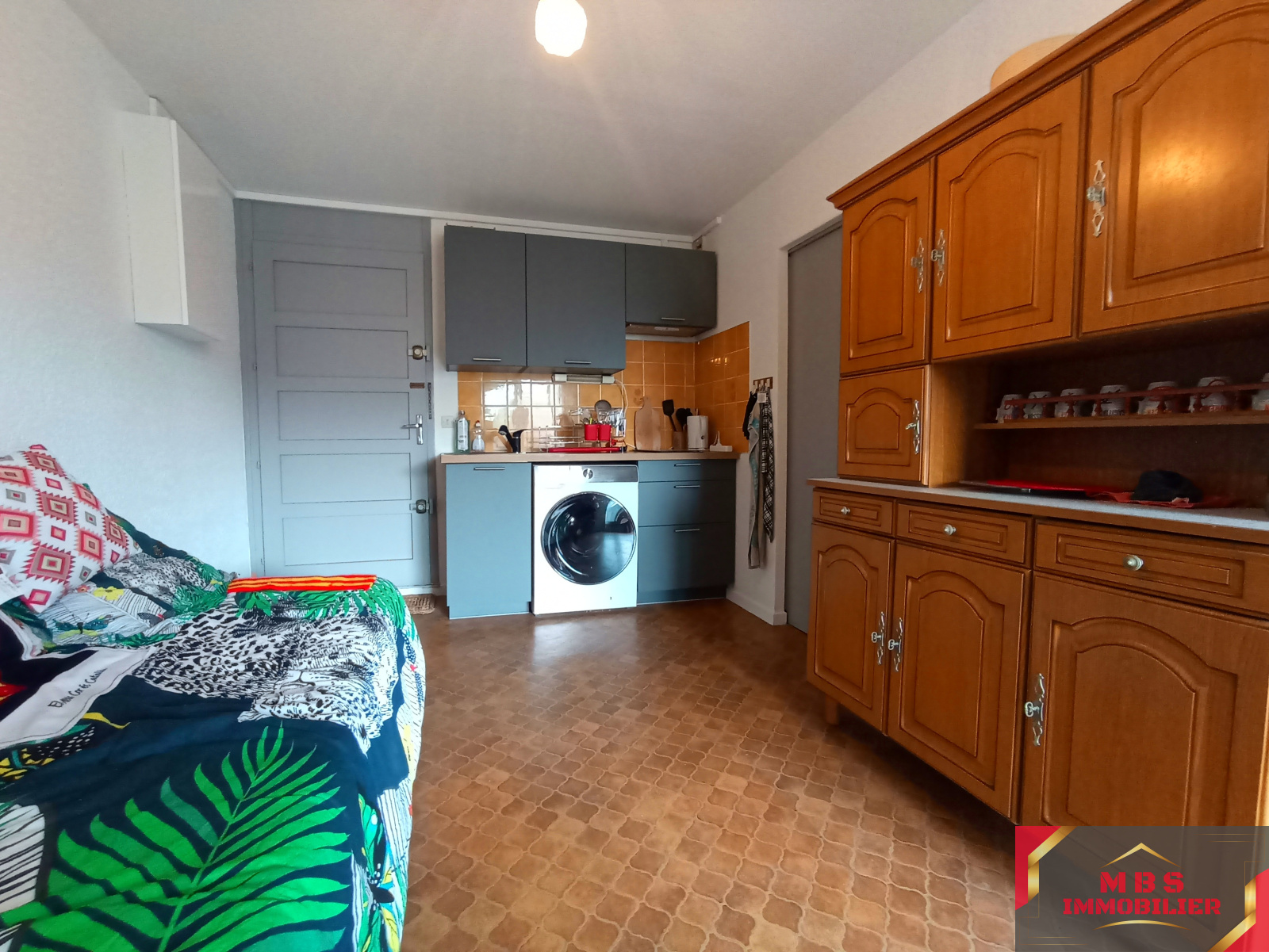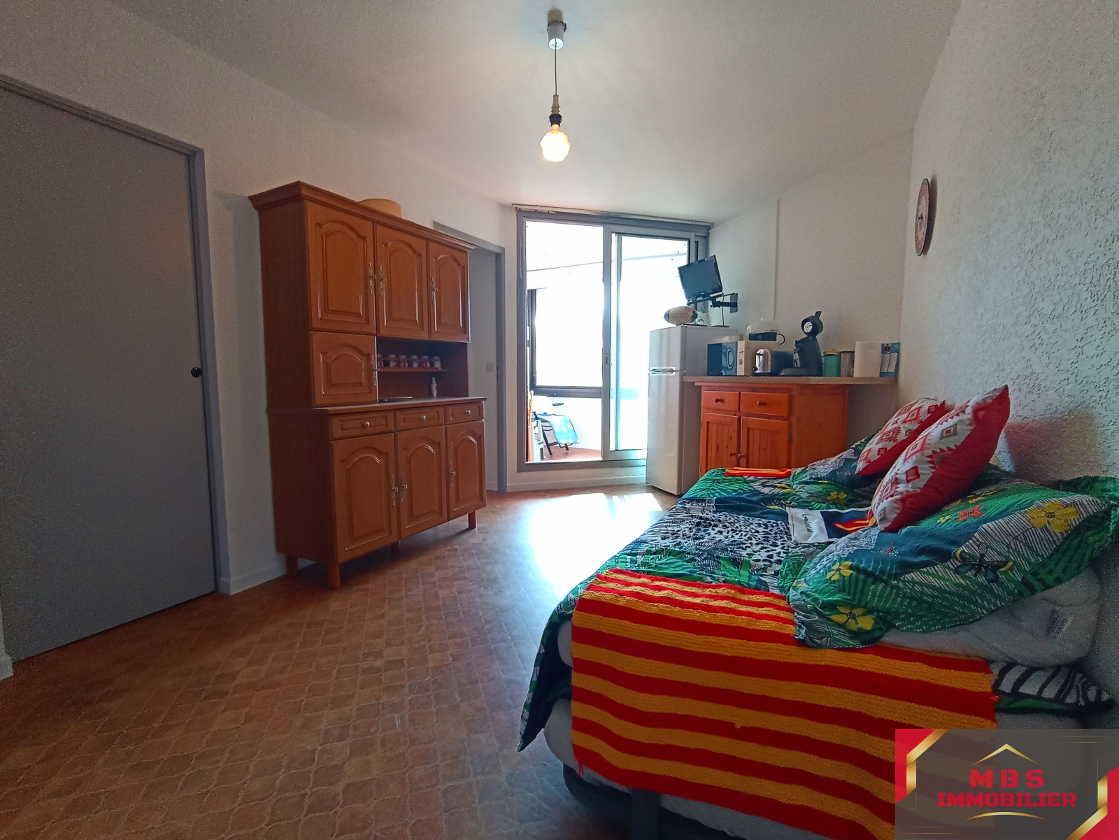 Au premier étage d'une résidence sur deux niveaux, l'entrée donne sur une pièce de vie ouverte avec kitchenette équipée et sa terrasse fermée d'environ 7m².