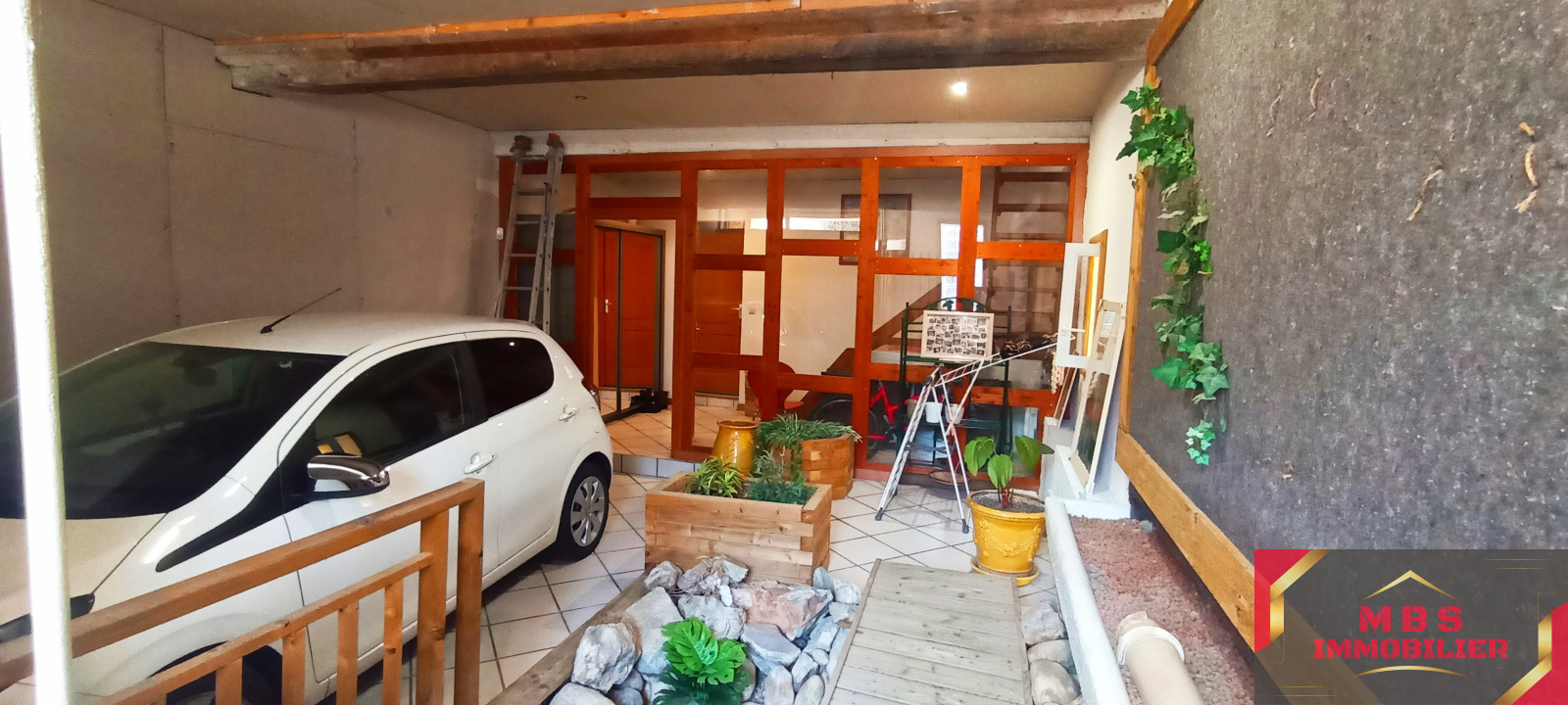 Grand garage avec accès indépendant, baie vitrée séparant l’espace garage de la partie habitable formant un sas d’entrée, espace de rangement supplémentaire d’environ 9,41 m², buanderie indépendante et escalier menant à l’étage.